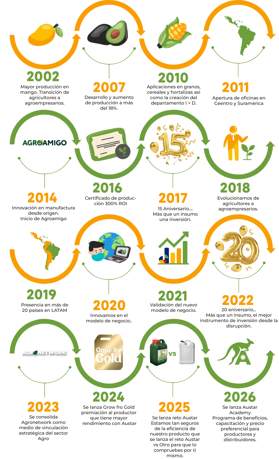 Austar ha demostrado resultados en diferentes tipos de cultivos agrícolas, mejorando producción, calidad y rendimiento.